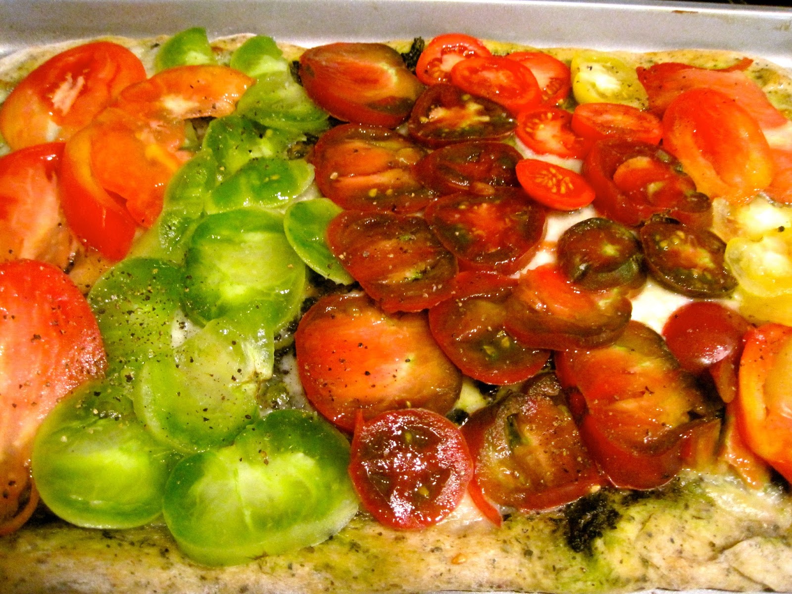 You can find the recipe and instructions here. The only changes I made: I used a whole grain crust and added garlic and herbs to the dough.